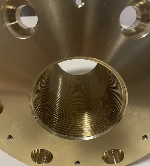 Изготовили маточные гайки из бронзы БрА9Ж3Л по индивидуальному чертежу заготовка - Ф225+2 х Ф130+2 х Ф75-2 х 190/35+2 методом цельной отливки заготовок. После отливки гайки в обязательном порядке прошли механическую обработку и проверку качества.
